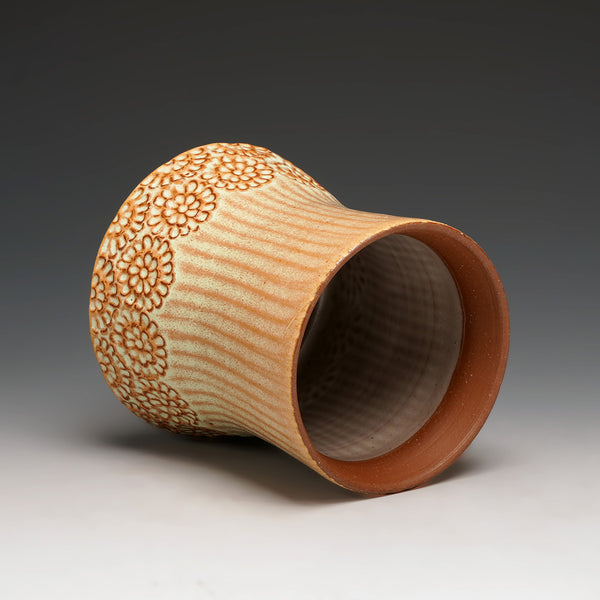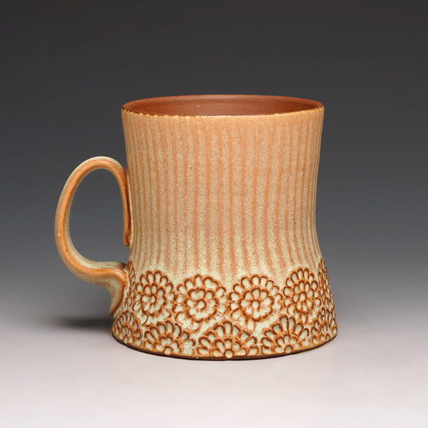cone 5 red stoneware and glaze with hand-carved floral motif