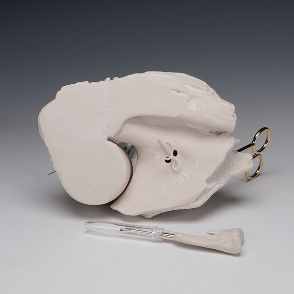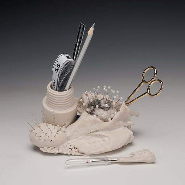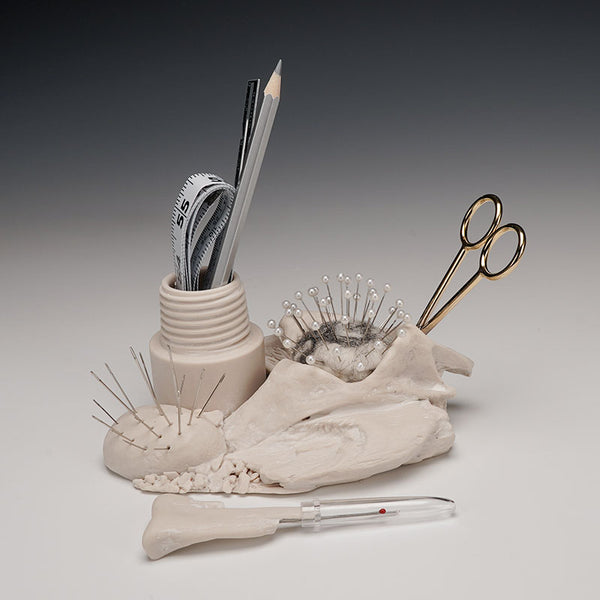 slip cast porcelain, underglaze, kanthal wire, found objects